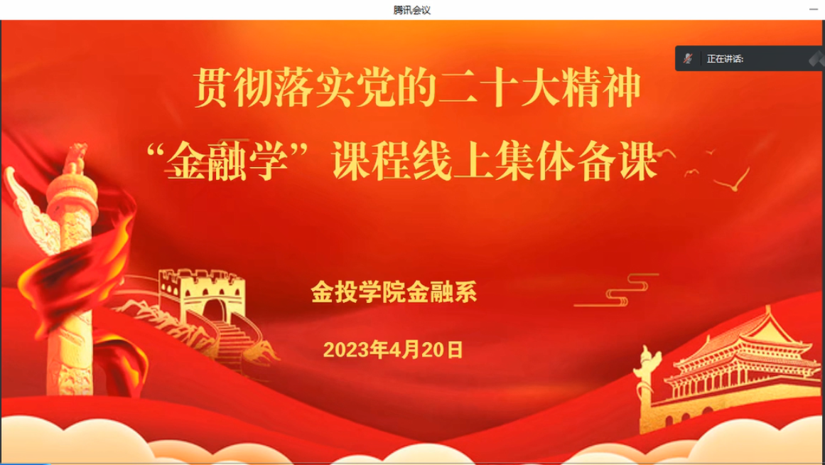 为了贯彻落实党的二十大精神,助力金投公司实现高质量发展的工作目标,太阳成集团tyc《金融学》课程组于2023年4月20日晚上八点通过腾讯会议举行了线上集体备课会,公司副经理刘昊虹、李日新、金融系主任王颖、副主任林梨奎以及王梅、石巧荣、周向雯、欧阳敏、程华强、饶华春、林力、鲁细根、吕建、陈雷、罗娟、刘璨、张婷希、曹昱葭、杨睿博、向海淩、韦璐、钱崇秀、李子文、王纯洁、罗丽萍、林爱杰、李心雅、吴丽鹂、王浩楠等29位授课老师参加了本次备课会。会议由王颖主任主持,并邀请程华强博士、周向雯副教授、陈雷博士等教学骨干老师重点介绍金融学的教学大纲、重点难点、教学方法及考研知识点。