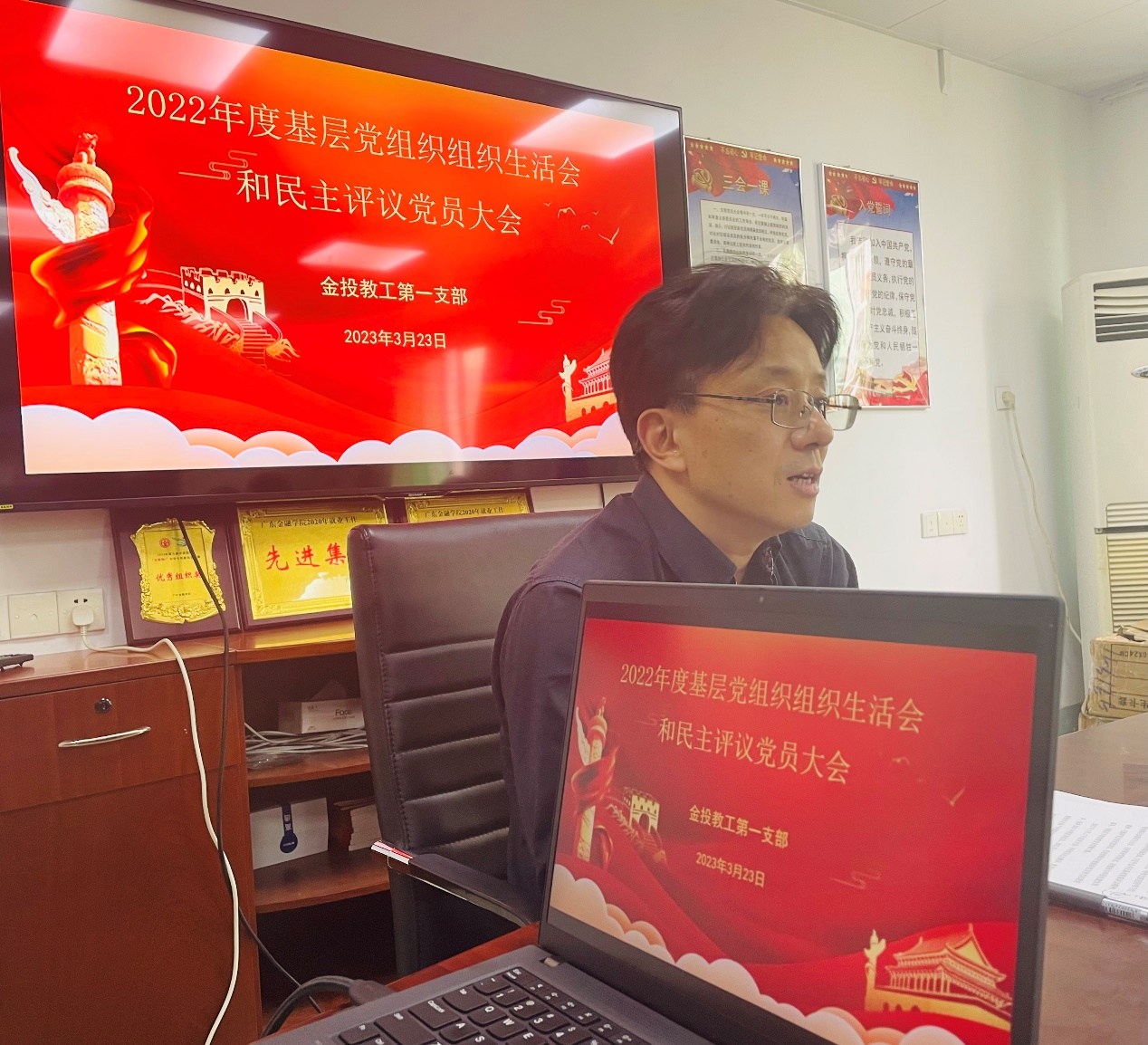 2023年3月23日,金投公司教工第一党支部在公司会议室召开“2022年度基层党组织组织生活会和民主评议党员大会”。会议由支部书记主持,易行健副董事长、颜佩仪书记及支部党员参加了本次会议。