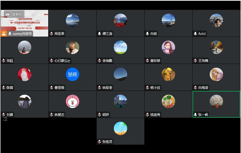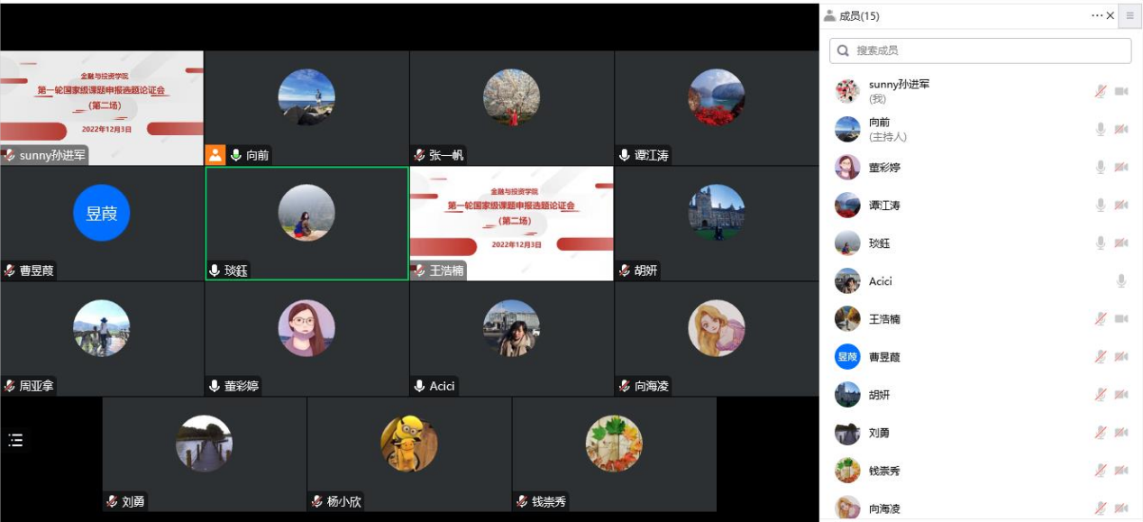 太阳成集团tyc组织22位年轻老师、以线上腾讯会议的形式举办了第一轮国家级课题申报(2023年)选题论证会(第一场:2022年11月27日下午2点15至5点50分;第二场:2022年12月3日下午14点15至16点30分)。经理项后军教授、副经理孙进军副教授,多名获得国家级课题立项的年轻老师以及拟申报国家级课题的教师参加了本次讨论会。