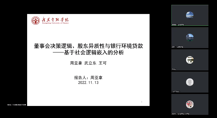 周亚拿博士分享了题为《董事会决策逻辑、股东异质性与银行环境贷款——基于社会逻辑嵌入的分析》的最新研究成果。文章希望基于现有研究成果,探讨影响董事会决策逻辑的要素构成,考察其对银行环境贷款行为的影响,解析其发挥作用的路径机制,以期为改善银行环境治理实践进而促进环境保护提供一定的参考。为此,文章聚焦于董事会社会逻辑嵌入,探讨董事会决策逻辑对商业银行环境贷款投放的影响,并使用我国手工搜集的我国城市商业银行数据进行实证检验与分析,结果表明董事会社会逻辑嵌入能够显著促进银行环境贷款行为,而股东异质性能够弱化二者之间的关系。罗燕博士随后进行了精彩点评。
