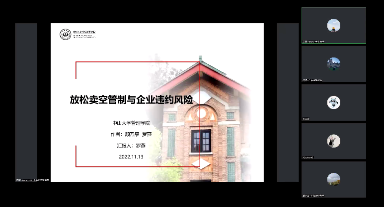 罗燕博士分享了题为《放松卖空管制与企业违约风险》的最新研究成果。在我国经济社会逐步转入高质量发展阶段、全球经济下行以及新冠疫情冲击下我国企业债务违约问题屡屡发生的经济背景下,文章利用我国融资融券制度和转融券制度的资本市场实践,系统检验了卖空机制对企业违约风险的影响及其内在机制。研究发现,卖空机制引入、卖空进一步放松和实际的卖空交易均显著降低了企业违约风险,表明卖空机制对企业违约风险具有治理效应。文章结论表明,卖空机制作为资本市场的交易制度,能够有效抑制企业的违约风险,从而为企业债务违约问题提供了一种市场化的解决途径。周亚拿博士随后进行了精彩点评。