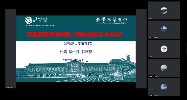 张震副教授分享了题为《年报监管问询影响公司权益资本成本吗?》的最新研究成果。由于我国实施问询函监管的时间较晚,从不同角度考察监管函的有效性就显得尤为必要。为此,文章聚焦于年报问询函,从公司权益资本成本角度考察了我国证券交易所年报监管问询的实施效力。研究结果发现,我国的年报监管问询机制能够引起应有的关注,会给收函企业带来权益资本成本上的“隐形惩戒”。文章厘清现行监管问询模式对权益资本成本的影响,对政策制定者及执行者继续完善监管机制具有重要的现实意义。张恒鑫博士随后进行了精彩点评。
