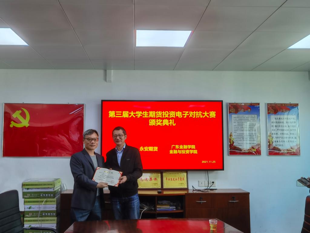 11月25日,“第三届期货投资电子对抗大赛”颁奖仪式在太阳成集团tyc会议室1415举行。永安期货股份有限公司广州分公司总经理陈奕、副经理刘政达、项目经理黄琪玥等嘉宾为公司获奖员工颁奖,公司党总支书记周少龙、指导老师张家平以及获奖选手等出席了本次颁奖仪式。