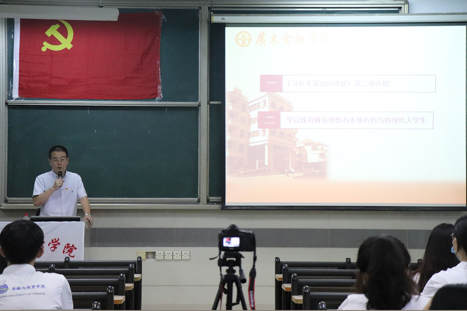 项经理则从“中国经济内外循环逻辑”视野开展党课的内容。项经理阐明我国开放型经济发展的条件和环境正发生的重大变化,讲诉以国内大循环为主体构建双循环的发展格局,就是要实施基于内需的经济全球化战略。同时,项经理就相应规划提出了建议,新环境下需要新发展格局和新战略转向。现在随着我国经济发展水平的迅速提升,我国的优势已经发生了重大的改变,必须考虑我们自己的竞争优势已经从低成本转向以内需为主。最后,项经理强调我们要紧跟时事发展学习,呼吁同学们应当了解这个时代的命题所在,鼓励金融学子要将“个人梦”和“中国梦”结合起来,争取成为契合时代的人才