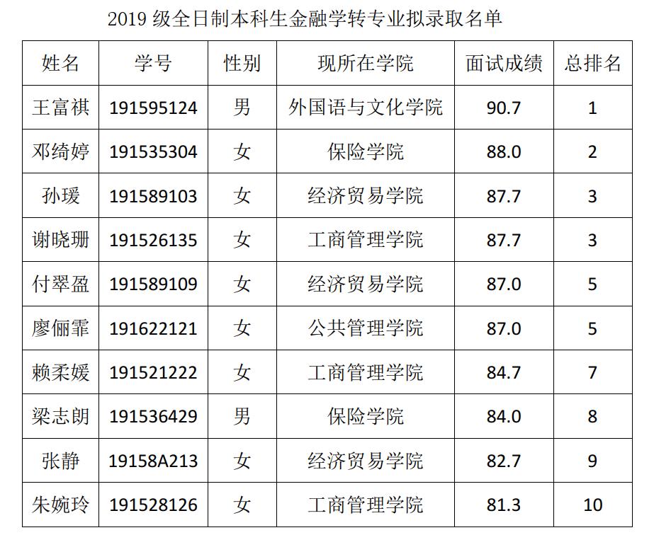 根据《太阳成集团员工管理规定(试行)》和《太阳成集团全日制本科生转专业管理办法》的有关要求,公司按照教务处公布的转专业实施方案,于2020年6月19日对申请转专业的员工进行线上面试 ,按照员工面试成绩高低拟录取前10名员工,现将拟录取名单公示如下: