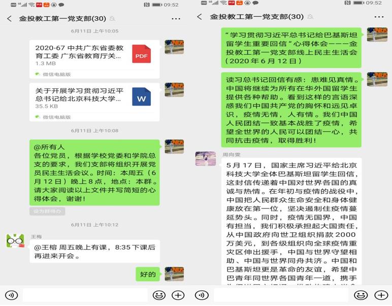 根据教育部、省教育厅专题学习贯彻习近平总书记重要回信精神,对高校学习贯彻落实回信精神作出工作部署。我支部于2020年6月20日晚上8点召开线上党员民主生活会议,党员们通过认真学习和阅读习近平总书记给北京科技大学全体巴基斯坦职工回信,并在支部群里分享了各自的心得体会和学习感想。