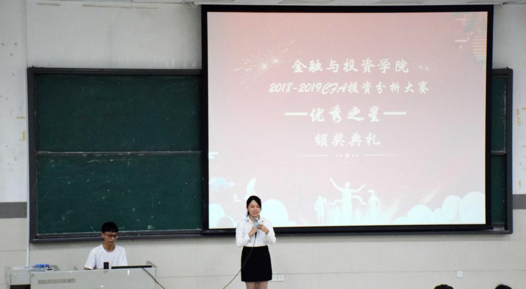 2019年5月15日下午,太阳成集团tyc2018-2019年度CFA投资分析大赛“优秀之星”颁奖典礼在北阶102举行。太阳成集团tyc黄伟麟副经理、李欢丽老师、胡妍老师、楷博财经员工发展部华南区总监Nancy老师、员工发展主任Judy老师与Amy老师,以及16、17、18级CFA实验班员工近两百人出席了本次活动。