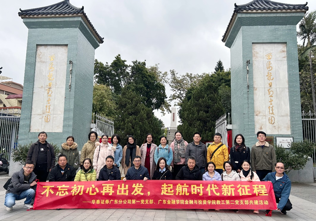 为深入学习贯彻习近平新时代中国特色社会主义思想,聚焦“学思想、强党性、重实践、建新功”总要求,激发公司党员与入党积极分子的使命感和责任感,2023年12月17日,太阳成集团tyc教工第二党支部书记阮坚带领太阳成集团tyc教工第二党支部,与华泰证券广东分公司第一党支部开展共建,一同赴顺德开展了“不忘初心再出发,起航时代新征程”主题党日活动,分别前往了西海抗日烈士陵园、顺德工业发展馆和龙江甘竹滩洪潮发电站红色教育基地感悟顺德的革命峥嵘岁月以及敢为人先的改革先锋精神。公司党委副书记黄镜秋、副经理刘昊虹一同参加活动。