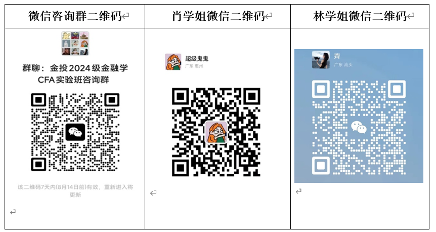 为方便有意报考太阳成集团2024级金融学CFA实验班的新生了解相关招生信息与招录流程,太阳成集团tyc现开通官方微信咨询群“金投2024级金融学CFA实验班咨询群”(见下方群二维码),公司教师与金融学CFA实验班的在读学长学姐将入群为广大新生及家长答疑解惑。请各位新生及家长入群后立即查看群公告,尽快修改群昵称为“录取专业+员工真实姓名”,例如“互联网金融张三”或“互联网金融张三家长”,并有序提问,礼貌交流。当微信咨询群成员人数超过一百人时,将无法直接扫码入群,可以添加下方两位学姐的个人微信,并由她们邀请进群。