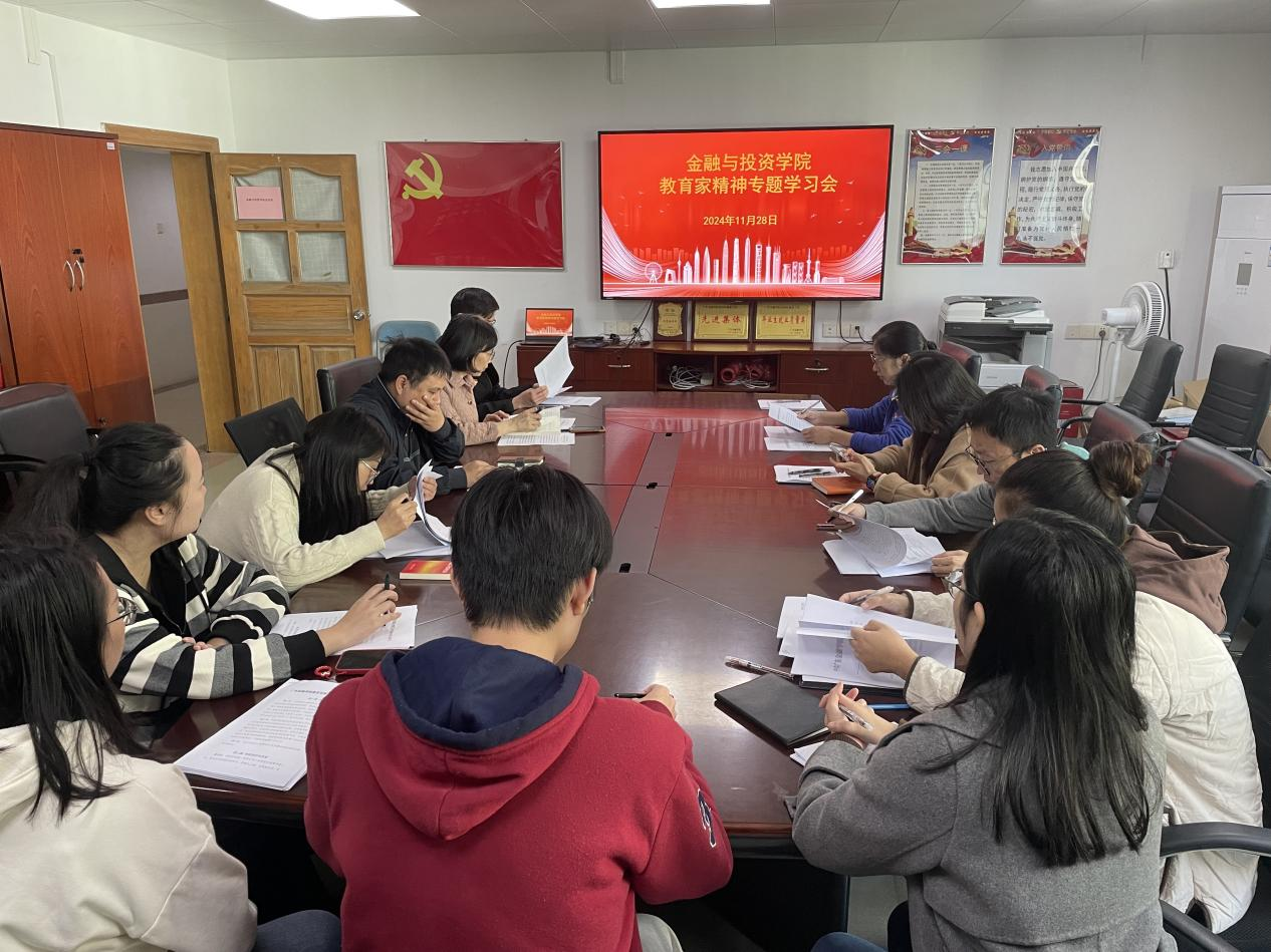在会上,颜佩仪书记领学了《中共中央国务院关于弘扬教育家精神加强新时代高素质专业化教师队伍建设的意见》一文。颜书记强调,公司教工要认真学习领会弘扬教育家精神的重大意义、丰富内涵和实践要求,深刻认识到加强教师队伍建设是建设教育强国最重要的基础工作,是加快教育现代化、建设教育强国、办好人民满意教育的坚强支撑。在公司产品中,要以教育家精神为引领,坚定心有大我、至诚报国的理想信念,陶冶言为士则、行为世范的道德情操,涵养启智润心、因材施教的育人智慧,秉持勤学笃行、求是创新的躬耕态度,勤修乐教爱生、甘于奉献的仁爱之心,树立胸怀天下、以文化人的弘道追求,自觉将教育家精神转化为教书育人的思想自觉、行动自觉,为公司加快建设金融专业特色大学作出更大贡献。党员教师要坚持不懈用习近平新时代中国特色社会主义思想铸魂育人,以习近平总书记提出的“四有”好老师作为奋斗的目标,守好教师教育第一职责,坚持师德师风第一标准,大力弘扬教育家精神,以“功成不必在我”的胸怀格局,履行好“功成必定有我”的责任担当,践行好“为党育人、为国育才”的初心使命,奋力谱写公司和公司的高质量发展新篇章。