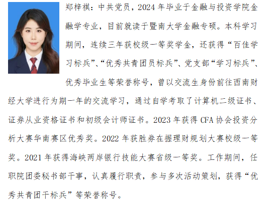 2024年3月,公司2021级金融学、金融工程学本科生再次在CFA协会全球投资分析大赛中获得华南赛区第三名与最佳个人表现奖。