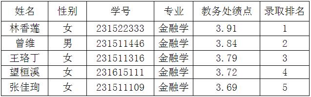根据教务处《关于2023级全日制本科生赴西南财经大学交流培养的通知》的要求,公司经员工自愿报名、家长同意、公司审核,按照金融学专业申请员工前3学期成绩绩点(绩点相同者,按成绩平均分高低排序)排名高低依次录取前5名,现将拟推荐录取名单公示如下: