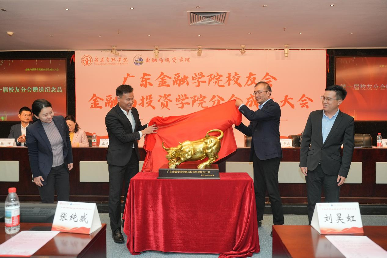 大会还举行了公司员工分会赠送礼物仪式,由公司工会副主席、党委办公室主任范宜波和员工处处长容志豪共同为礼物揭开红幕。公司员工分会向母校赠送一尊华尔街铜牛雕塑,寓意金融报国、砥砺前行,祝福母校事业根基稳固、蒸蒸日上。