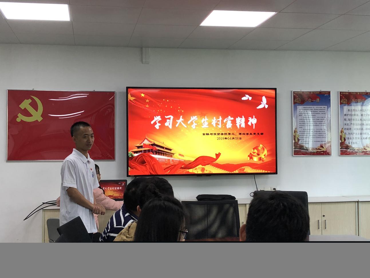会议开始,我们通过新闻播报了解了陕西女村干部李佳佳以“放弃高薪扎根小山村,引领村民脱贫致富”的感人事迹,同时她也当选了当月敬业奉献“中国好人”,还有老员工村干部贺建刚引领村民脱贫致富等的故事,从这些事例当中我们更加深刻地了解到老员工村干部的重要性,从而更加激发我们当代老员工为党和国家、为社会贡献出自己的一份力。新闻播报之后我们继续学习老员工村官精神:负责、创新、科学、务实、民主。紧接着我们进行了视频学习,在林水龙同学的带领下我们对老员工村官精神都有了更进一步的了解。在此基础上,支部党员积极地进行了交流,刘海坤老师分享了自己家乡的故事,向大家讲述了更多关于村干部工作的细节,党员同志们认真聆听,并且从中潜移默化地明白了老员工村官的精神内涵。