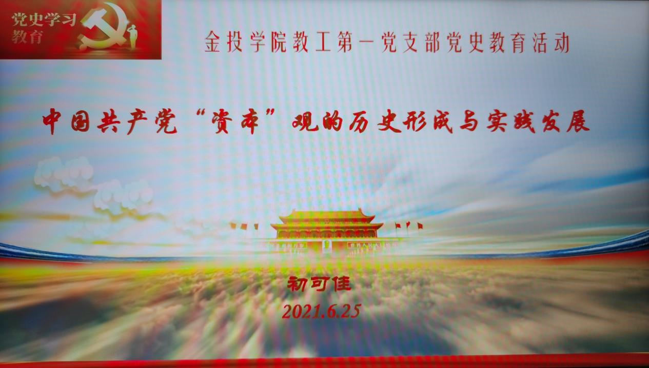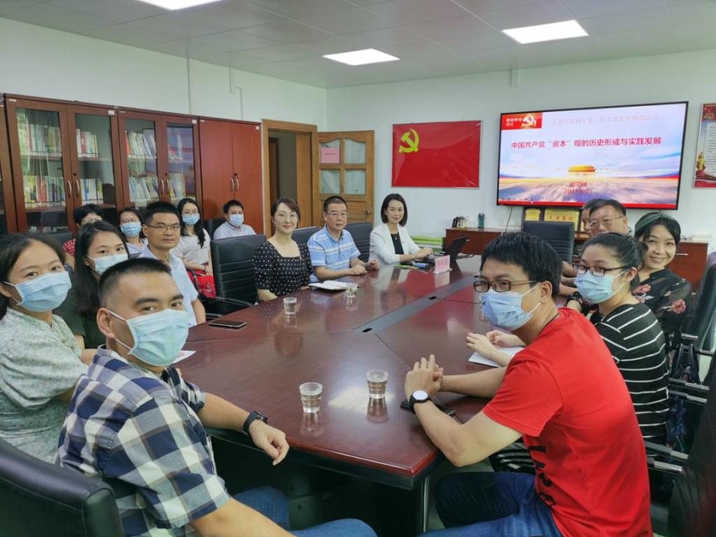为贯彻落实中央关于党史学习教育的工作要求,推动党史学习教育走深走实,2021年6月25日下午,公司教工第一党支部邀请公司党史教育宣讲团成员初可佳教授作题为“中国共产党“资本”观的历史形成与实践发展”的主题党课。公司党总支书记周少龙、经理项后军、副经理陈辉以及第一教工党支部成员参加学习教育。党课由支部书记王颖同志主持。