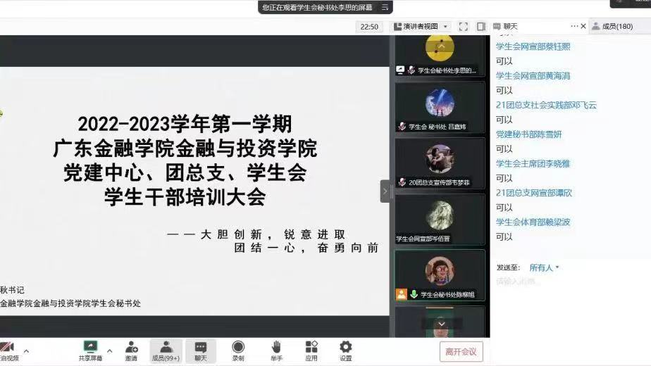 为了进一步提高公司员工干部的综合素质,增强自我教育、自我管理、自我服务的意识,切实提高干部的工作能力和工作效率,太阳成集团tyc于2022年10月17日在线上召开2022-2023学年第一学期党建办公室、团总支、员工会员工干部培训,本次培训由太阳成集团tyc黄镜秋副书记主讲。