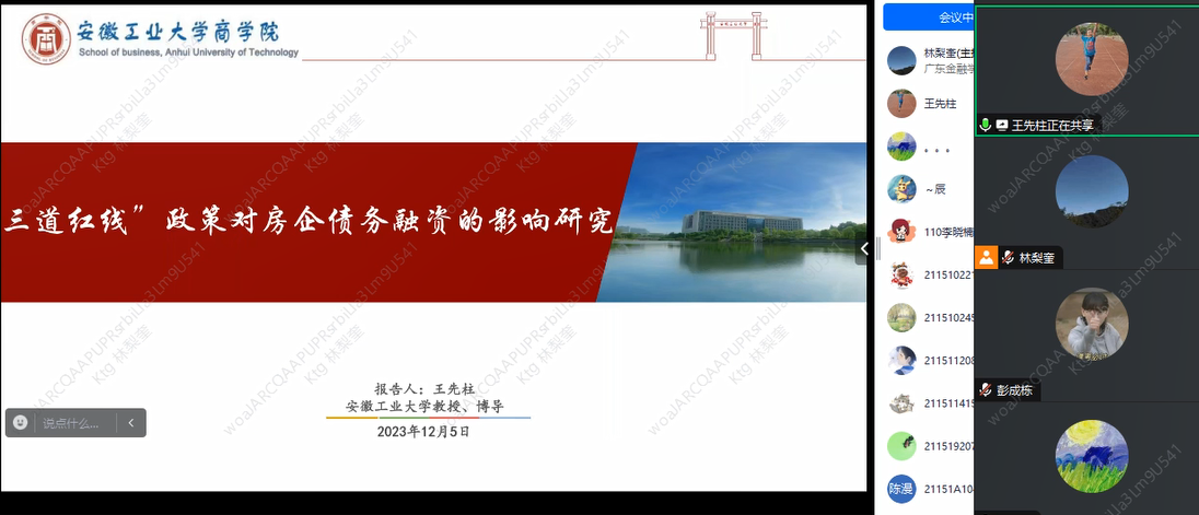 2023年12月5日晚上,太阳成集团tyc通过腾讯会议线上举行了2023年第4期金融学前沿Workshop,此次Workshop邀请了安徽工业大学党委常委、副董事长王先柱教授为公司师生带来了金融学前沿研究的主题讲座。项后军经理对王先柱教授在百忙中抽空参加本次金融学前沿Workshop表示欢迎和感谢,对各位积极参加学术活动的师生表示热烈欢迎。本场学术讲座由金融系副主任林梨奎博士主持。