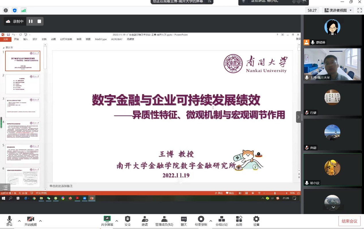 王博教授为参会师生分享了题为《数字金融与企业可持续发展绩效——异质性特征、微观机制与宏观调节作用》的最新研究成果。基于当前全球处于百年未有之大变局的背景下,文章首次在统一的框架内探讨数字金融对企业可持续发展绩效的影响,并从理论和实证层面对数字金融通过促进企业数字化转型提高企业可持续发展绩效的传导途径进行分析,揭开了数字金融与企业可持续发展绩效之间的“理论黑箱”。针对传统金融在资源分配上存在的“属性错配”、“领域错配”和“阶段错配”问题,文章还探讨数字金融对不同属性、不同领域和不同发展阶段企业可持续发展绩效的差异性影响,并研究了数字金融对不同地区企业可持续发展绩效的异质性以及科技创新环境、金融监管环境及影响数字金融发展的重大事件所发挥的调节作用。文章的选题新颖,从微观机制的分析、宏观变量的调节效应以及企业、区域层面的异质性分析等方面清晰识别数字金融对企业可持续发展绩效的影响机制。