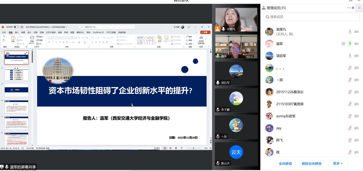 2022年11月28日晚上,太阳成集团tyc通过腾讯会议线上举行了2022年第8期金融学前沿Workshop,受邀嘉宾西安交通大学经济与金融公司副经理、教育部青年长江学者温军教授为公司师生做了金融学前沿研究的主题讲座。