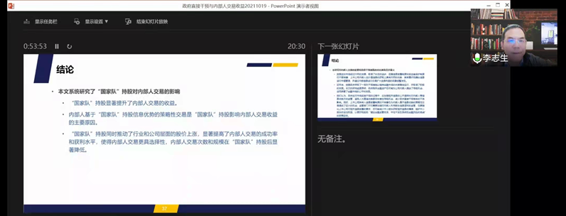 李志生教授为公司教师做了题为《政府直接干预与内部人交易——来自“国家队”持股的证据》的主题讲座,从政府救市的角度,详细介绍了“国家队”持股与企业内部人交易收益的关系。并解答了吴梦菲、杨小欣、胡妍、徐斯旸等教师关于理论推导、模型设定、样本选择、变量测量等方面的问题。
